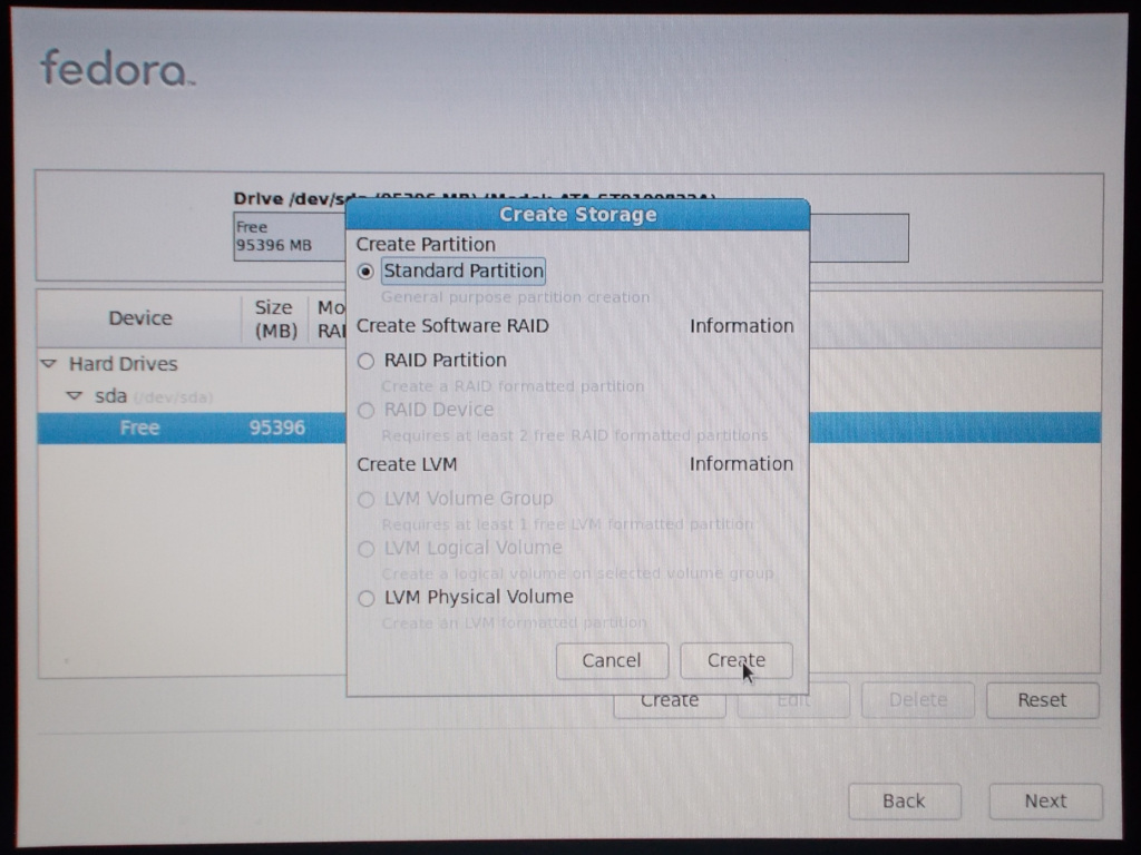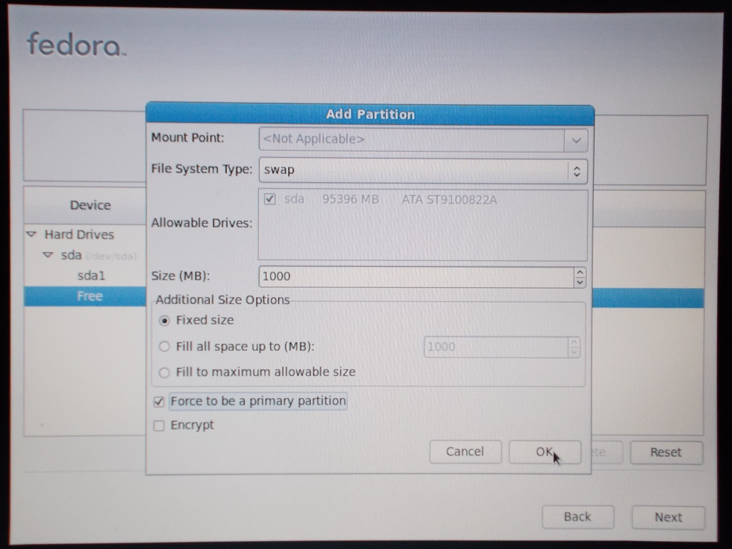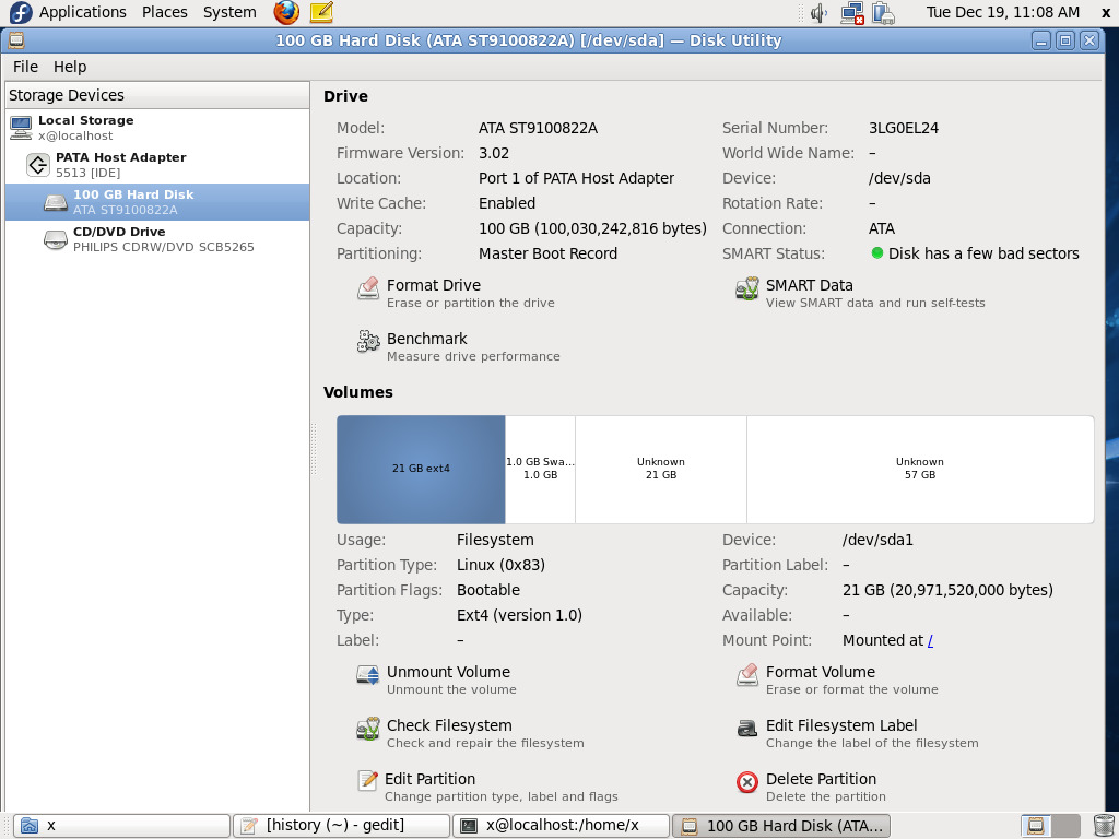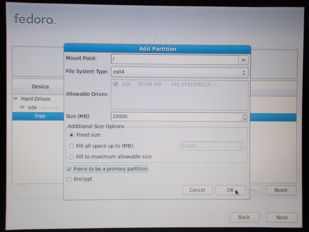 n Command (m for help): p Disk /dev/sda: 100.0 GB, 100030242816 bytes 255 heads, 63 sectors/track, 12161 cylinders, total 195371568 sectors Units = sectors of 1 * 512 = 512 bytes Sector size (logical/physical): 512 bytes / 512 bytes I/O size (minimum/optimal): 512 bytes / 512 bytes Disk identifier: 0x92121ea4 Device Boot Start End Blocks Id System /dev/sda1 * 2048 40962047 20480000 83 Linux /dev/sda2 40962048 43010047 1024000 82 Linux swap / Solaris /dev/sda3 43010048 84953087 20971520 83 LinuxJust created the 3rd partition on the hard drive, /dev/sda3, which is only for the next system. Now the 4th, which will be used by both systems: