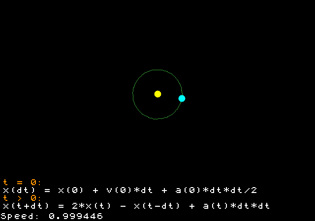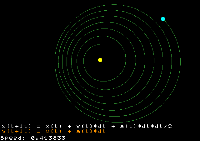In this case, the force F depends on the velocity of the particle:F(v(t)) = G + R(v(t)); G = m·g R(v(t)) = -k·(v(t) - vw)·|v(t) - vw| (3)where g is the gravitational acceleration, G is the weight, R(v(t)) is the air's resistance (drag), v(t) is the speed of the particle and vw is the wind speed. Equation of motion (2) can be solved numerically, which usually means finding r(t) and v(t) at t1, t2, t3,...,ti, ti+1,..., where ti+1 = ti + Δt. Some methods are exemplified below. r(ti+1) = r(ti) + v(ti)·Δt v(ti+1) = v(ti) + a(ti)·Δt (4)Equations (4) are known as Euler's method and are used here. r(ti+1) = r(ti) + v(ti)·Δt + a(ti)·(Δt)2/2 (5)Equation (5) is called the SUVAT method and is used in SimCar. The equations for the case in which the acceleration is considered to have a linear variation between ti and ti+1 can be found in file Equations.pdf from Cannon.zip, in my PhD thesis on pages 76 and 77, and in file doc/doc.pdf from mtfem-2.0.0.tar.gz, on pages 18 and 19. The methods presented so far are based on Taylor polynomials, but Verlet's method, suitable for computing trajectories of planets and other particles moving in various force fields, uses a slightly different approach (see Equations.pdf).