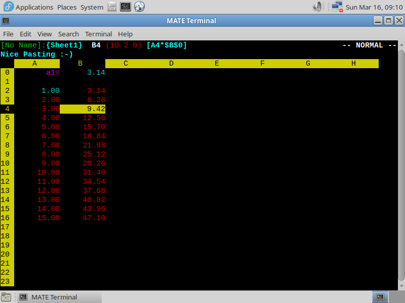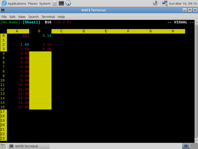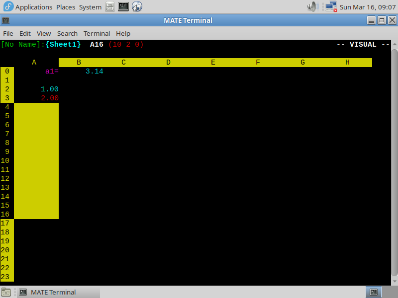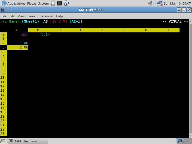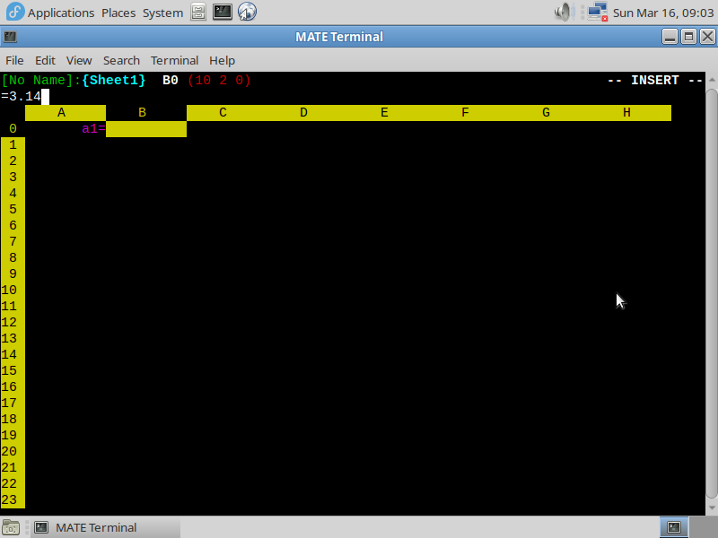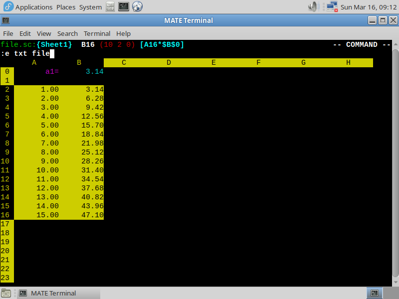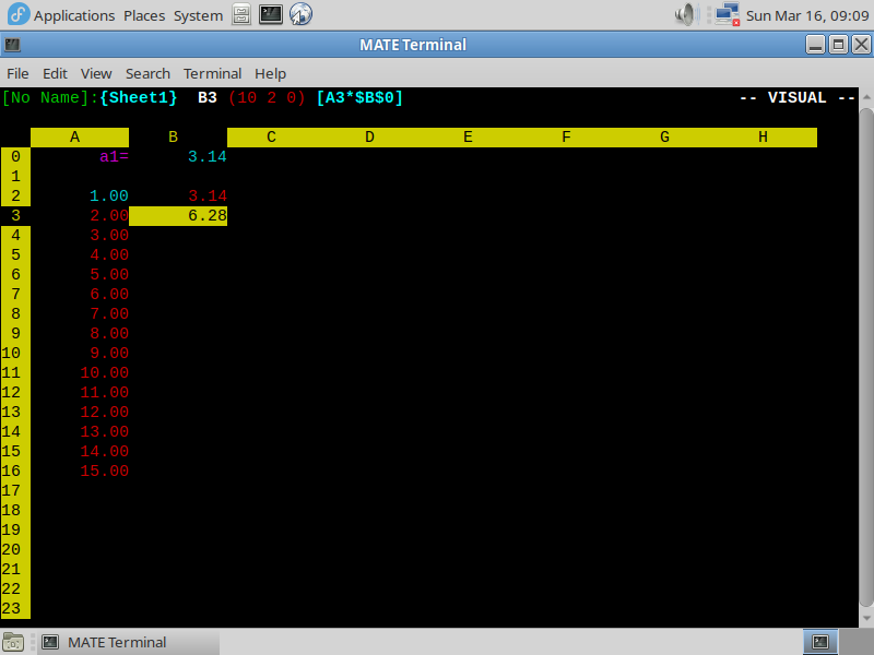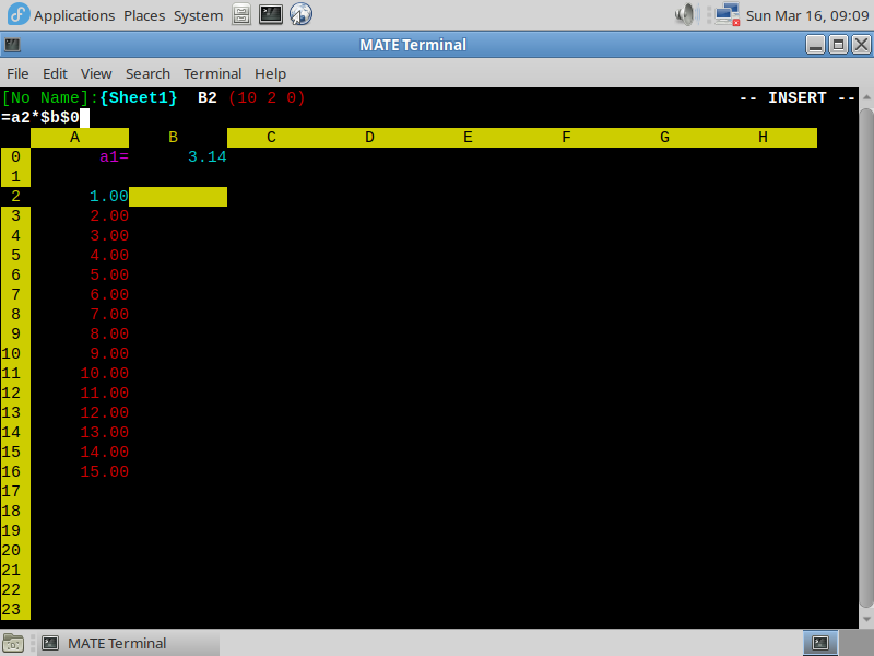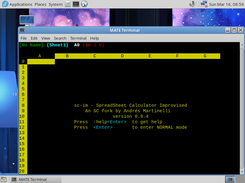 Updated 2025-10-01 sc-im - Spreadsheet Calculator Improvised Download It's available at github.com/andmarti1424/sc-im and version 0.8.5 is below. "Spreadsheet Calculator Improvised, aka sc-im, is an ncurses based, vim-like spreadsheet calculator". MD5: 8560c8833aafa917ccc78cd7ff522527 Requires m4, bison, sed and the latest ncurses. It also works on old GNU/Linux distributions, like Fedora Core 6, which requires CFLAGS = -std=c99 in src/Makefile. It might also requirevoid yyerror(char *err) converted tovoid yyerror(const char *err) in files tui.h, gram.y and tui.c from directory src.Examples