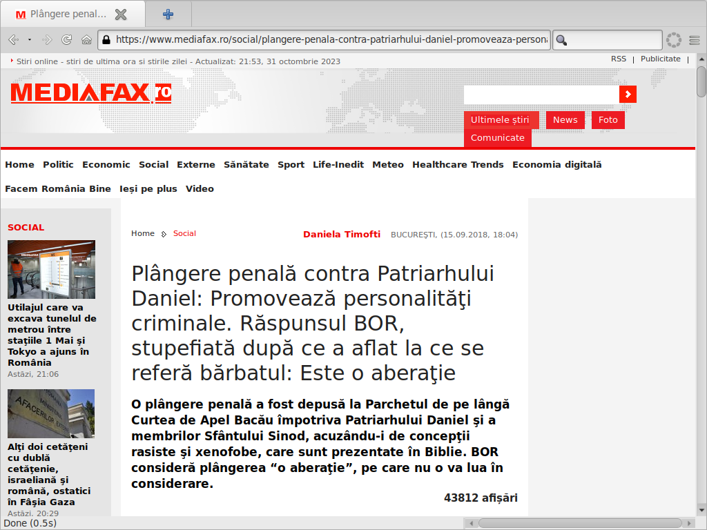 MD5: 966053a14b85ada1d1220cfd1273d746 MD5: 6c579e68175936a185a5b6a9ef0ebe66 A few fragments: CRIMINAL COMPLAINT XII) paedophile trend. On one occasion, in particular, he demanded from the spoils of war 32 girls aged over three years. However, the question is controversial because, according to that culture and that historical and temporal context, it was permissible to perform sexual acts with children above that age; This fragment refers to Numbers 31:40And the persons were sixteen thousand; of which the LORD'S tribute was thirty and two persons. The persons that God demanded for himself were women children (Numbers 31:18), as they were the only ones left alive, and this was part of the division of the spoils of war described in the translated criminal complaint, on pages 10 and 11. Vasilică Militaru didn't mention Numbers 31:40, but he did notice that in the description of the spoils of war, the animals are presented first and then the surviving virgin women, taken as sex slaves. Animals were more valuable than female slaves. Of course, from the expressions psychopathological profile and psychopathological diagnosis we can only retain the word psychopath, because the suffix -ological and the word diagnosis have no place in the context of psychology or psychiatryIV) violent. In geometry, a straight line is defined as a line with no curvature. The curvature is the amount by which a curve deviates from being a straight line and it should already be obvious that we're not getting anywhere. In 1931, Kurt Gödel published two theorems referring to mathematical demonstrations The first incompleteness theorem states that no consistent system of axioms whose theorems can be listed by an effective procedure (i.e., an algorithm) is capable of proving all truths about the arithmetic of natural numbers. For any such consistent formal system, there will always be statements about natural numbers that are true, but that are unprovable within the system. The second incompleteness theorem, an extension of the first, shows that the system cannot demonstrate its own consistency. Ignoring (or not knowing) these facts, some people have attempted, even less successfully, to define notions much more complex than a straight line, such as, for instance, a woman, or consciousness, also known as sentience, and although even less is known about consciousness than about natural numbers, this didn't stop people from making silly statements, sometimes even in articles presented as scientificThe human brain is the most complex of all biological organs; it not only gives rise to consciousness-[...]-but also mediates our behavioural responses. If this is a scientific article, then science must be a synonym for poppycock, because the brain can not give rise to consciousness. If someone were to make an identical copy of you, down to the last subatomic particle, and if what would be obtained would be a functioning person, that person would not be you, i.e. would have a different consciousness, in spite of per brain being identical to yours (if you disagree with this idea, I don't have any further arguments to support it). On the other hand, your brain changes significantly throughout life while your consciousness remains the same. This is one of the reasons why machines will never be sentient, however complex they may be.Are you me? In religion, the consciousness is usually referred to as the soul, and many people are preoccupied with what happens to the soul after the body ceases to function (i.e. death), because unforeseen consequences may arise. Fortunately, the Bible is pretty clear in this matter.Matthew 10:28 And fear not them which kill the body, but are not able to kill the soul: but rather fear him which is able to destroy both soul and body in hell. Revelation 13:1,8And I stood upon the sand of the sea, and saw a beast rise up out of